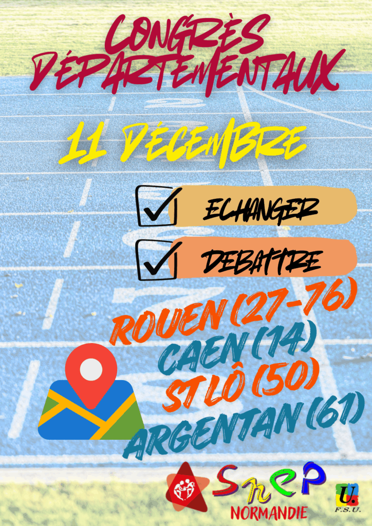 Les congrès départementaux auront lieu le Jeudi 11 Décembre. Ils sont ouverts à tous.tes les profs d’EPS syndiqué.es qui souhaitent participer aux débats.